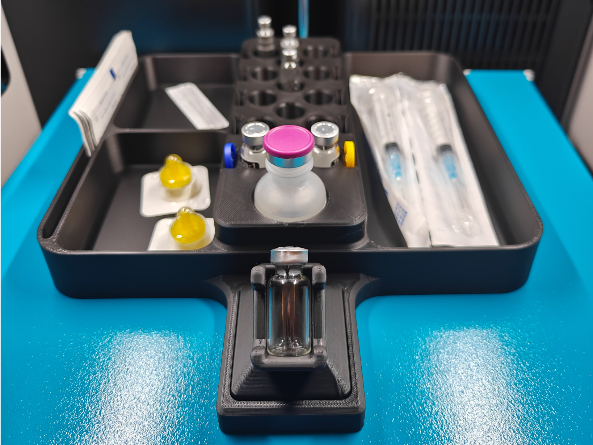 Estación de reconstitución impresa en 3D, diseñada para organizar y facilitar el manejo de viales. Cuenta con espacios para viales regulares, viales tipo pluma(con purga de aire) y un compartimiento para agua bacteriostática de 30 ml. Además, incorpora un práctico sujetador de viales que brinda apoyo al momento de aplicar etiquetas, mejorando la precisión y comodidad en el proceso.
